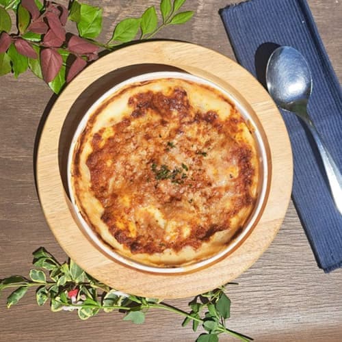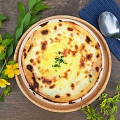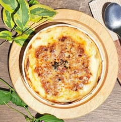 国産小麦、八ヶ岳山麓の牛乳から作ったホワイトソースとチーズをたっぷりかけてからオーブンで焼き上げました。