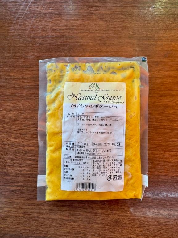 原材料:牛乳、かぼちゃ、玉葱、生クリーム、大豆油、焼塩、鶏だし、ホワイトペッパー